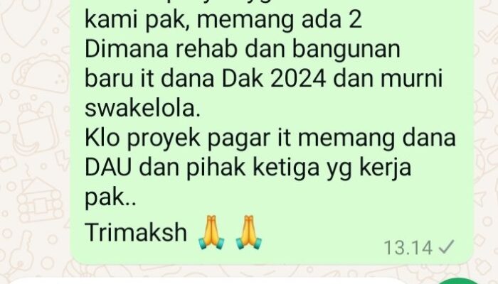 Parahnya lagi satu sekolah ada dua pekerjaan termasuk pembangunan pagar pengaman yang di kerjakan oleh pihak ketiga, rehab dan bangunan baru yang nilai anggarannya ya miliaran rupiah juga di pihak ketiga kan sehingga mengundang banyak pertanyaan di kalangan aktivis penggiat media sosial, informasi, kepsek lagi pelatihan di Makassar, isi pesan singkat whatsappnya