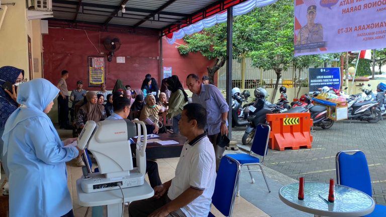 Makassar, Dalam rangka merayakan Dirgahayu Bhayangkara Ke 79 tanggal 1 Juli 2025, Polsek Tamalanrea Polrestabes Makassar menggelar Bakti Sosial Pemeriksaan Mata Gratis dan Donor Darah.