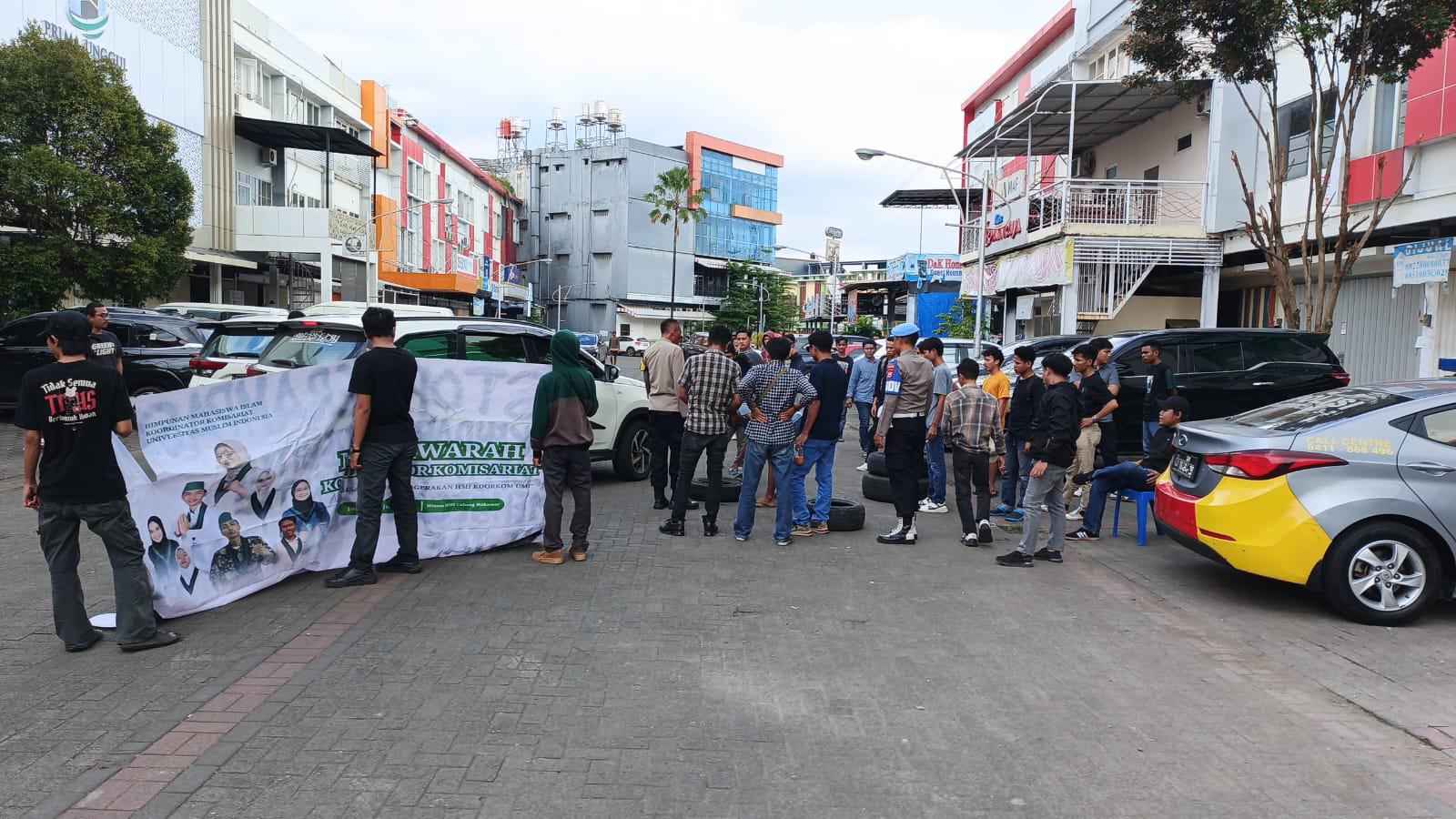 Makassar — Personel Polsek Rappocini Polrestabes Makassar melakukan mengawal terhadap aksi unjuk rasa yang digelar oleh Aliansi Hijau Hitam Makassar di depan gedung Toyota Astra Finance (TAF) Makassar, Selasa (15/7/2025).