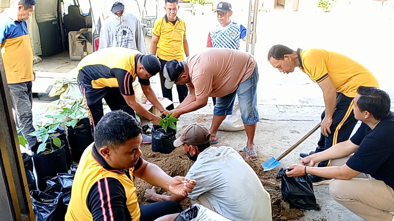 Makassar – Personel Polsek Biringkanaya Polrestabes Makassar bersama warga melaksanakan kegiatan gotong royong menanam bibit pohon cabe di wadah polibag, Sabtu pagi (27/9/2025).