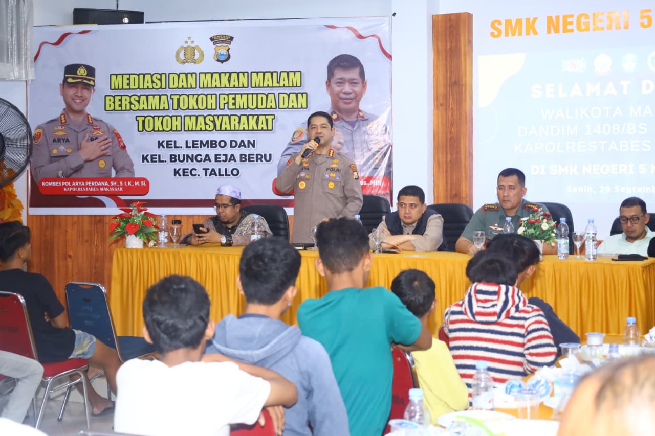 Makassar – Kapolrestabes Makassar, Kombes Pol Arya Perdana, SH, SIK, M.Si, memediasi sekaligus mengajak makan bersama tokoh pemuda, tokoh agama, dan tokoh masyarakat dari Kelurahan Lembo, Layang, serta Bunga Eja Beru, Kecamatan Tallo, yang sebelumnya sempat bertikai. Kegiatan tersebut digelar pada Senin malam (29/9/2025) di Gedung Serba Guna SMKN 5, Jalan Sunu, Kecamatan Tallo.