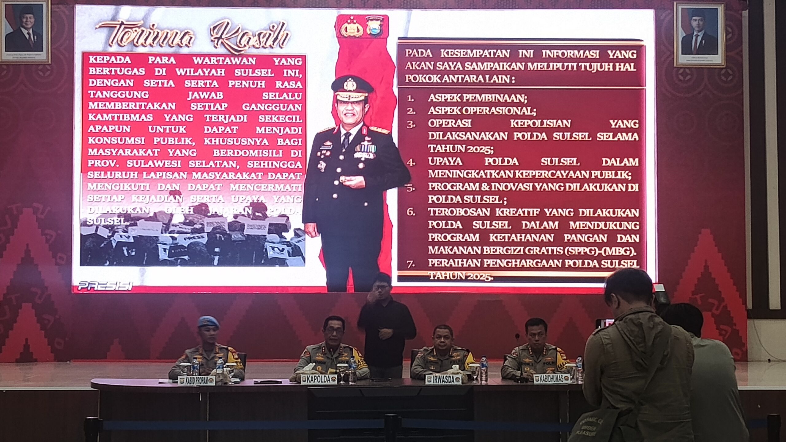 *Press Release Akhir Tahun 2025, Kapolda Sulsel Paparkan Capaian Kinerja dan Situasi Kamtibmas Sepanjang Tahun 2025*Kegiatan tersebut berlangsung di Aula Mappaodang Mapolda Sulsel dan dipimpin langsung oleh Kapolda Sulawesi Selatan Irjen Pol. Djuhandhani Rahardjo Puro, S.H., M.H., Senin (29/12/2025).