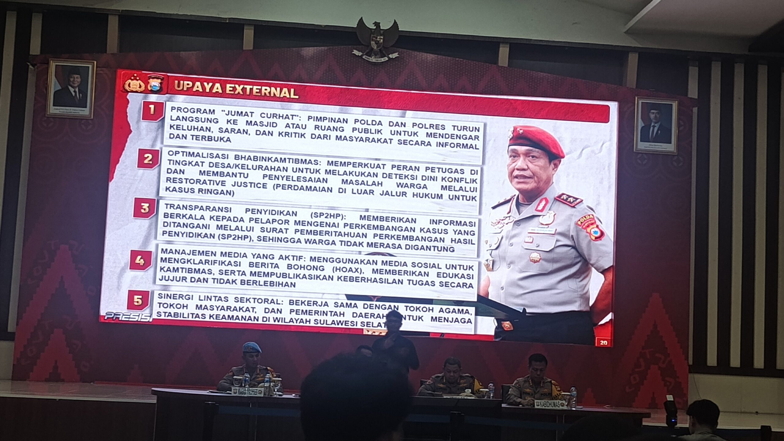 Kapolda Sulsel menjelaskan bahwa informasi yang disampaikan dalam press release akhir tahun ini mencakup tujuh aspek utama, yaitu aspek pembinaan, aspek operasional, pelaksanaan operasi kepolisian sepanjang tahun 2025, upaya peningkatan kepercayaan publik, program dan inovasi Polda Sulsel, terobosan kreatif dalam mendukung program ketahanan pangan dan makan bergizi gratis, serta penghargaan yang diraih Polda Sulsel selama tahun 2025.Dalam bidang keamanan, keselamatan