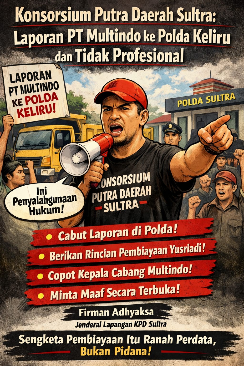 Jenderal Lapangan Konsorsium Putra Daerah Sultra, Firman Adhyaksa, menegaskan bahwa pelaporan tersebut salah sasaran serta mencerminkan kegagalan perusahaan pembiayaan dalam memahami batas tegas antara sengketa perdata dan pidana.