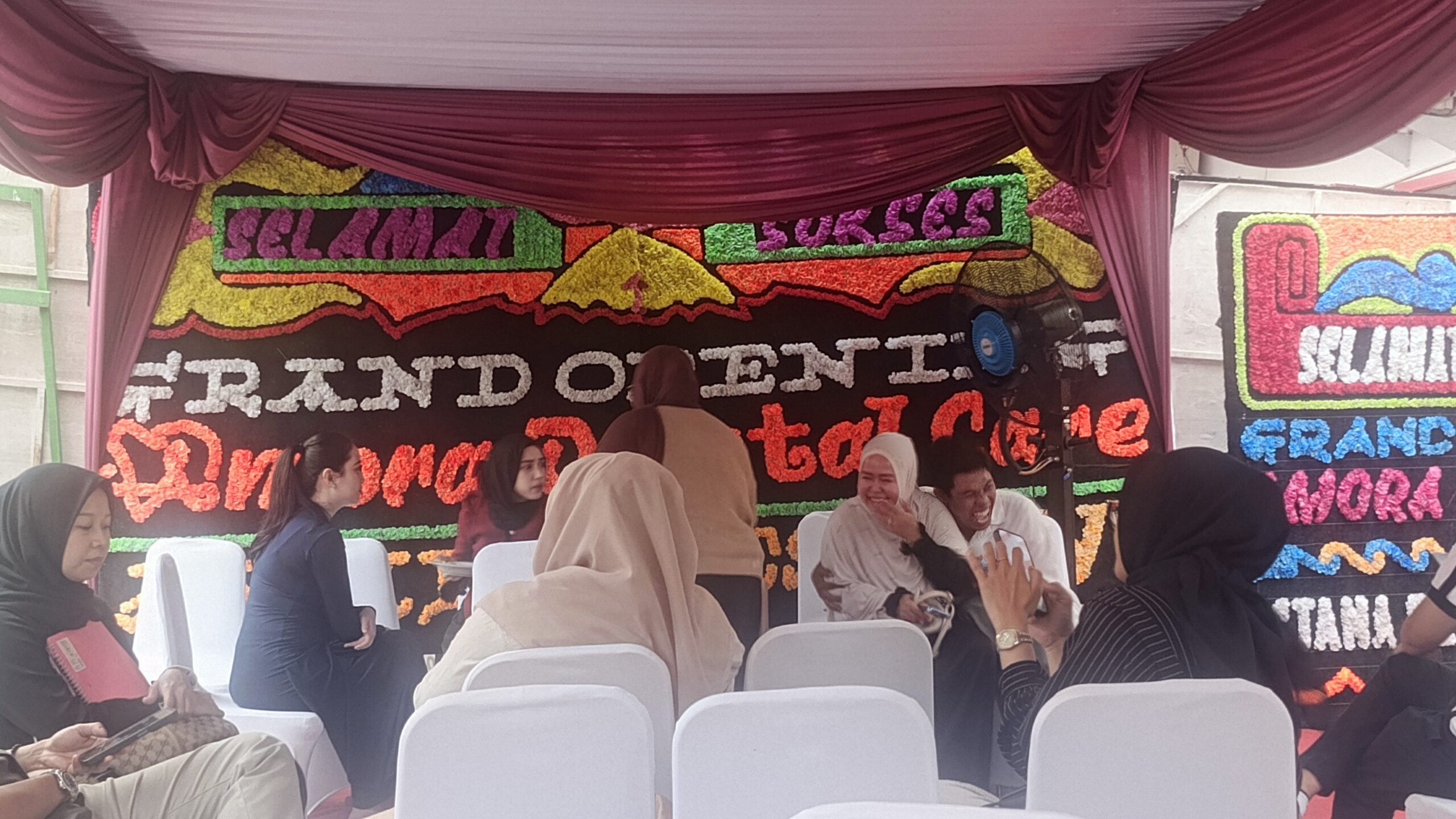 Pantauan di lokasi menunjukkan suasana penuh antusias. Para tamu terlihat mengabadikan momen di area foto yang telah disiapkan, lengkap dengan backdrop ucapan “Selamat & Sukses Grand Opening Amora Dental Care Anggu Batang”. Kehadiran balon dekoratif dan ornamen pembukaan menambah kesan elegan pada acara tersebut.