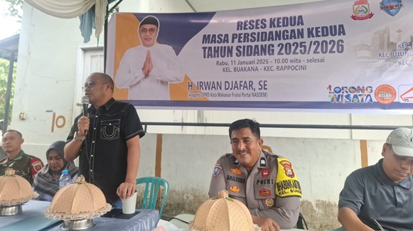 Makassar – Bhabinkamtibmas Polsek Rappocini Polrestabes Makassar Kelurahan Buakana, AIPTU Jamaludin, menghadiri kegiatan Reses Masa Sidang Kedua Tahun 2025–2026 yang digelar di Jalan Pelita, Kelurahan Buakana, Kecamatan Rappocini, Kota Makassar, Rabu (11/02/2026).