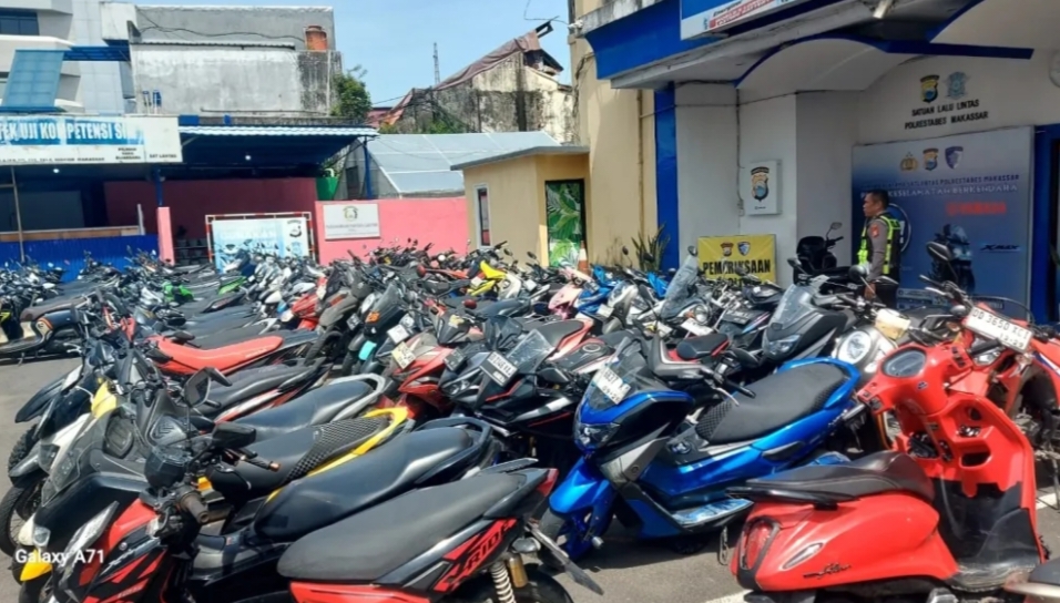 MAKASSAR,UB – Ratusan kendaraan roda dua dan roda empat terparkir di halaman parkiran Polrestabes Makassar. Ratusan kendaraan yang terjaring dalam razia digelar Satlantas Polrestabes Makassar akan diberi sanksi.