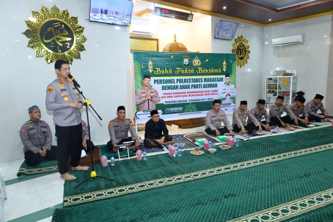 Dalam sambutannya, Kapolrestabes Makassar menyampaikan bahwa kegiatan buka puasa bersama dengan anak-anak panti asuhan merupakan bentuk kepedulian sosial sekaligus memperkuat nilai-nilai keimanan di bulan suci Ramadhan.
