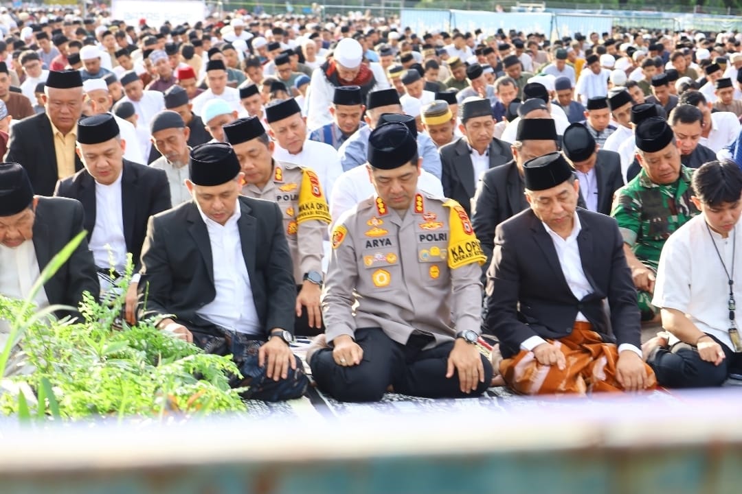 Makassar – Kapolrestabes Makassar, Kombes Pol Arya Perdana, SH., SIK., M.Si Sholat Idul Fitri 1 Syawal 1447 Hijriah yang digelar di Lapangan Karebosi, Jl. Achmad Yani, Kecamatan Ujung Pandang, Kota Makassar, Sabtu (21/03/2026).